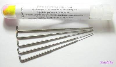 Второе - это специальные иглы с зазубринами - специальными насечками, благодаря которым они спутывают/ смешивают волокна шерсти, так происходит уплотнение - сваливание шерсти.