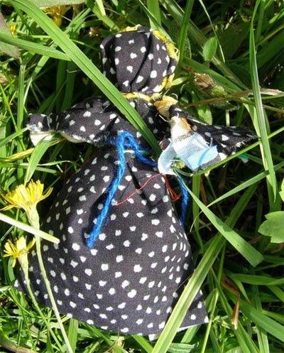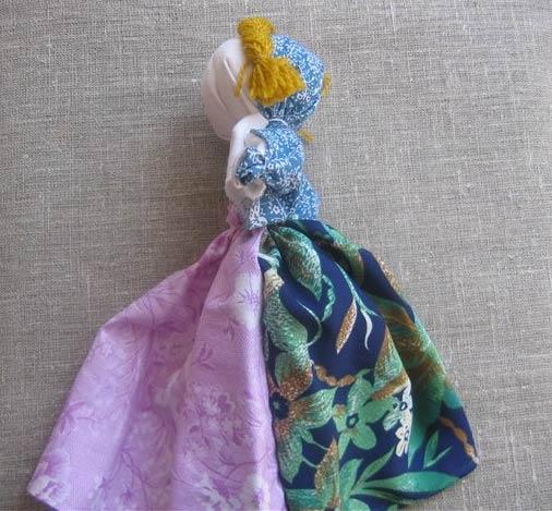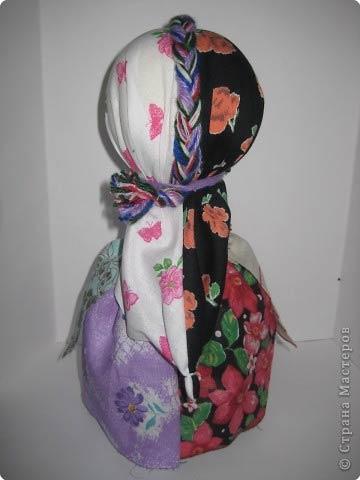 Делается такая кукла следующим образом. Берется 2 лоскутка и сшивается. Желательно это делать по традиции - в ручную и без использования ножниц. Далее делаем скрутку и наматываем нашу набивку. Собственно это мы делали уже в народной куколке Счастье. Затем одеваем наши 2 разных сшитых лоскутка так, чтобы 2 угла были спереди и сзади, направлены вниз, образуя блузку, в то время как 2 других угла образовывали руки. Концы этих рукавов - уголков надо подвернуть и перевязать, опять же так же, как мы делали с вами ранее. Далее шьется юбка и подвязывается пояском или фартуком. Вот и все - двуликая куколка День - Ночь готова.