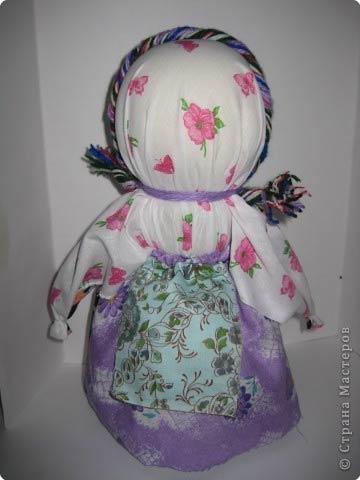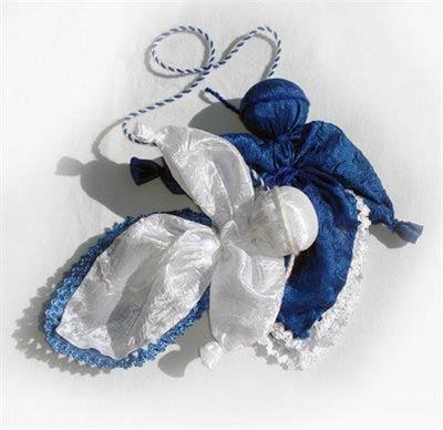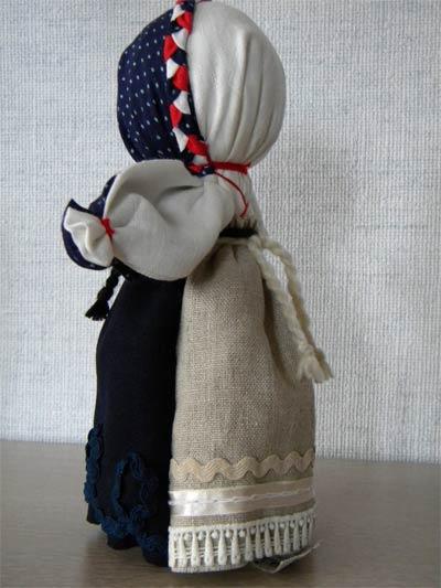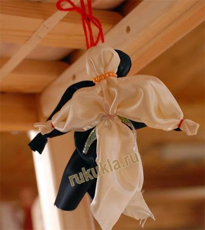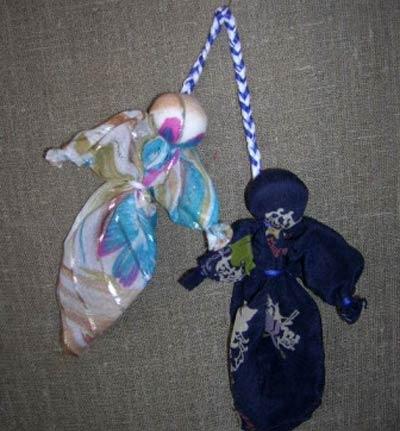 Второй вид - это две совершенно одинаковые куколки, только одна сделана из светлой ткани, вторая из темной. Куклы связаны двумя нитками - синей и белой и представляют собой единую цельную композицию.