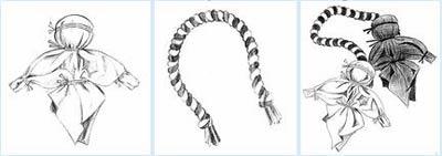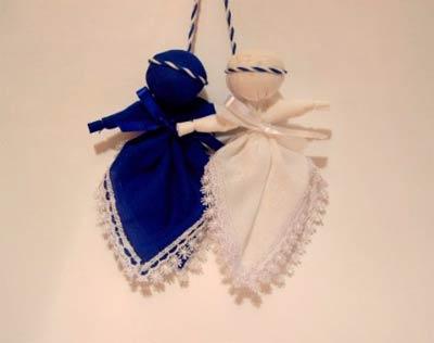 Из синей и белой нитки делается шнурок, который потом привязывается сзади к обеим куколкам.