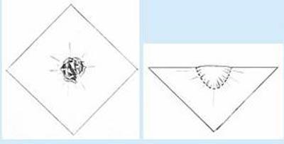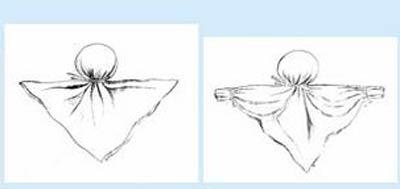 Подвязывается у шейки, подворачиваются и подгибаются уголки, образуя ручки: